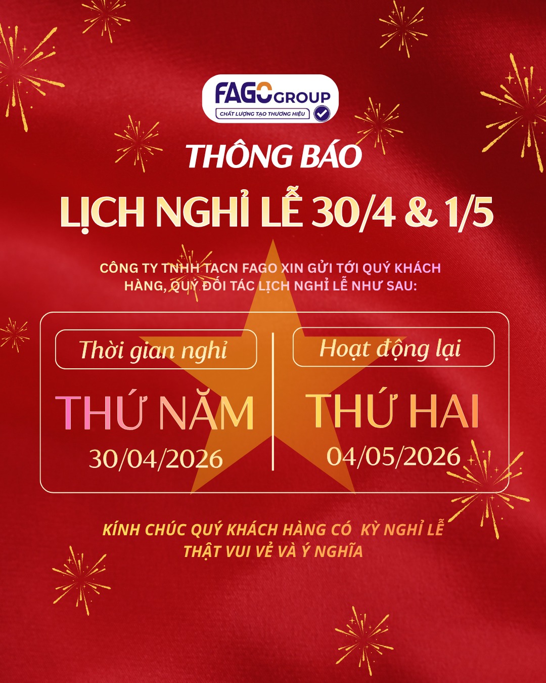 Fago kính chúc Quý khách và gia đình có một kỳ nghỉ lễ vui vẻ, an toàn và hạnh phúc!